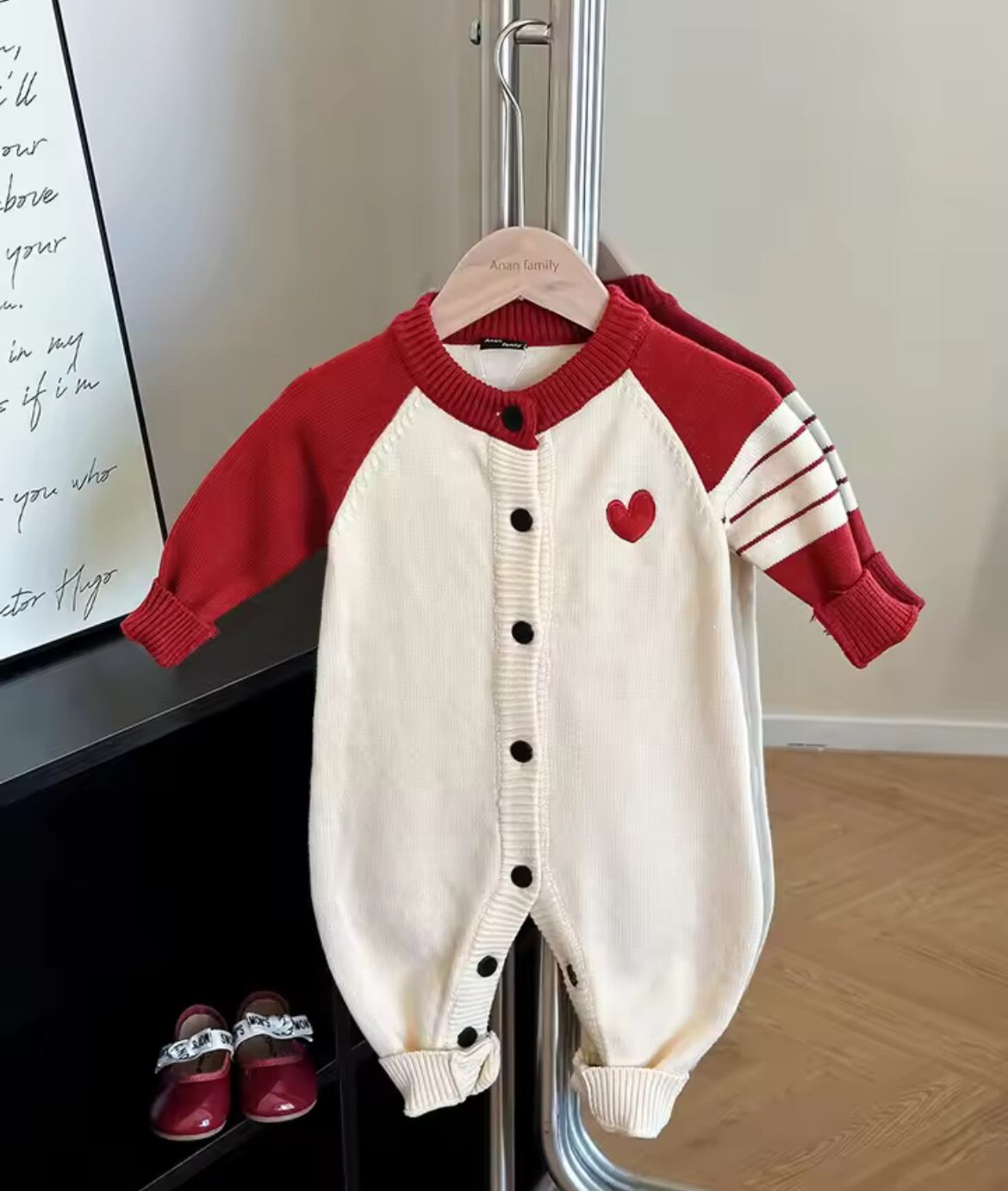 ハートがワンポイントのニットカーディガン ロンパース